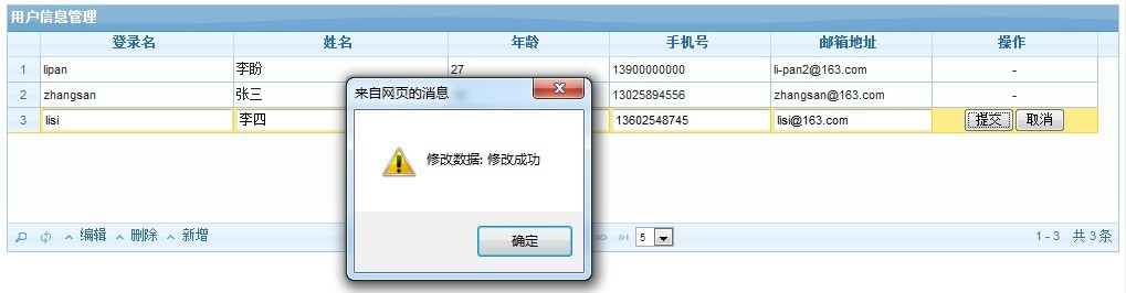 看到下图,是通过Jqgrid实现表格数据的基本增删查改的操作。表格数据增删改是一般企业应用系统开发的常见功能,不过不同的是这个表格数据来源是非关系型的数据库MongoDB。nosql虽然概念新颖,但是MongoDB基本应用实现起来还是比较轻松的,甚至代码比基本的ADO.net访问关系数据源还要简洁。由于其本身的“非关系”的数据存储方式,使得对象关系映射这个环节对于MongoDB来讲显得毫无意义,因此我们也不会对MongoDB引入所谓的“ORM”框架。
